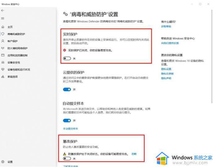 第一步:打开Defender设置,关闭“实时保护”和“篡改保护”。