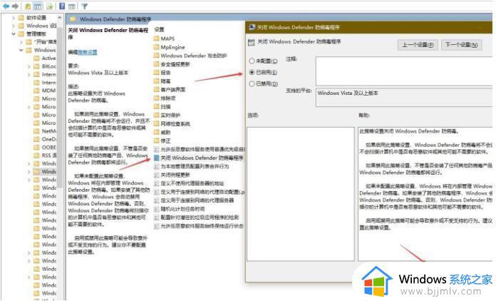 4、右侧双击“关闭 Windows Defender 防病毒程序”,然后在弹出对话框中选择“已启用”,然后点击确定即可。